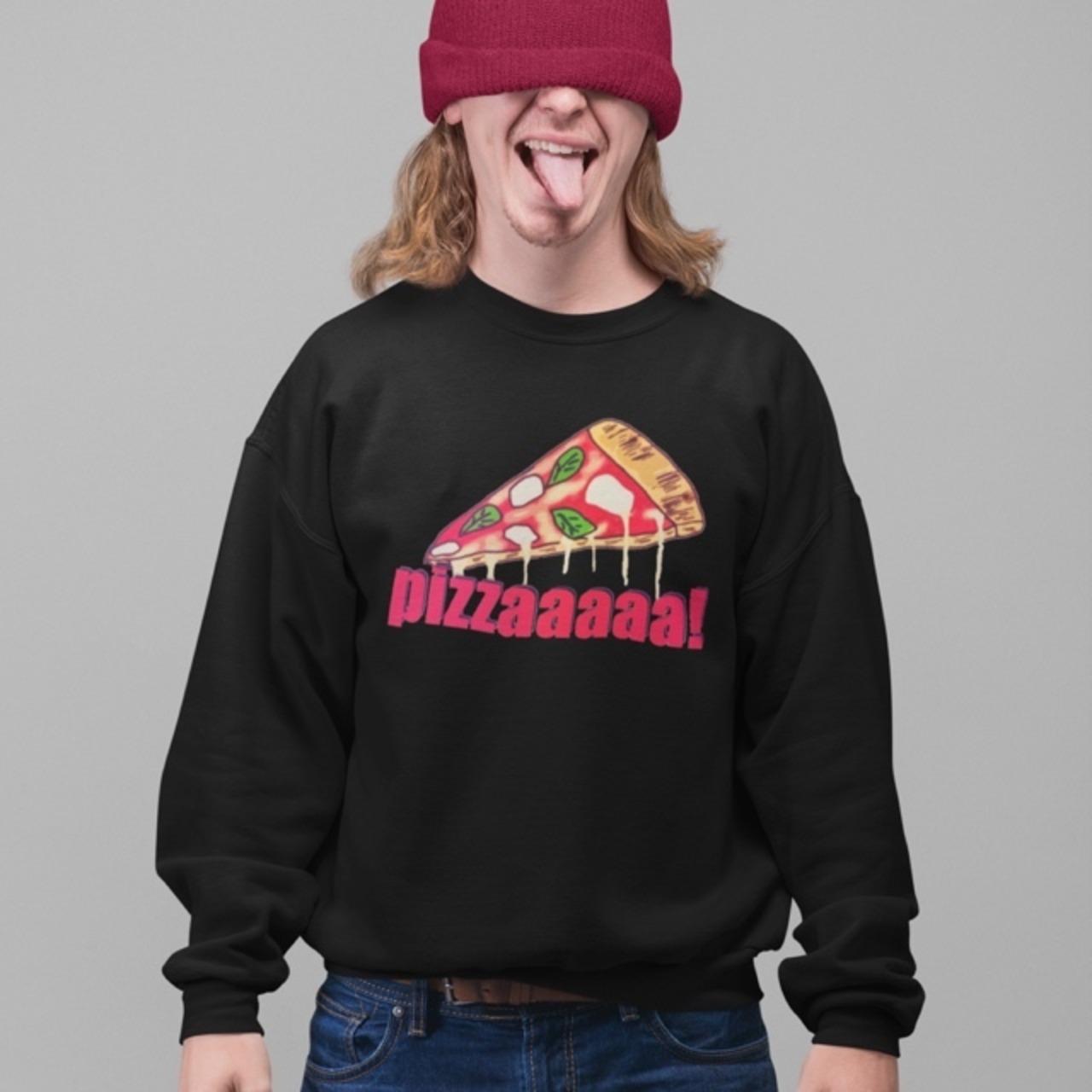 ピザをゆるく描き文字もふざけました。ゆるくダルダルに着ても様になるようにしました。